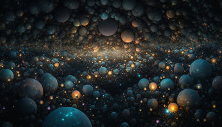 This abstract illustration features numerous glowing orbs, each showcasing a unique cosmic design. The orbs vary in size, with internal depictions of galaxies and energetic patterns. Soft lighting and a dark background create a visually engaging composition suitable for various applications. It could be useful for science, design and educational materials.