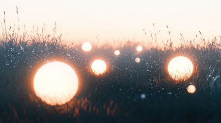 Radiant orbs of translucent light drift gracefully above a dewy meadow during early morning. The surreal atmosphere evokes a sense of calm and wonder in the tranquil landscape.