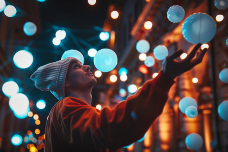 A man with his hands in the air surrounded by glowing balls, AI