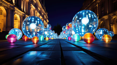 Illuminated spheres hanging in a modern light installation at night