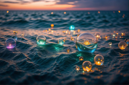 An AI generated illustration of colorful bubbles gently floating on the tranquil water
