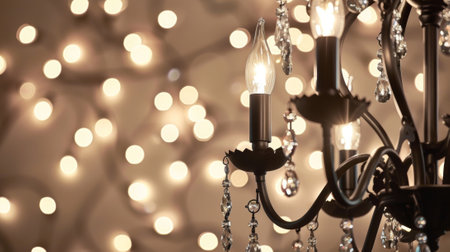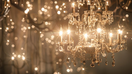 Experience the exquisite beauty of a crystal chandelier in a luxurious interior. This image showcases an elegant and ornate chandelier with shimmering crystal drops, casting a bright, golden glow. Soft candlelight and a blurry background create a romantic bokeh effect, highlighting the sparkle and glamour. Perfect for illustrating luxury decor, event planning, wedding venues, or showcasing upscale interior design. This vintage lighting masterpiece adds a touch of classic sophistication to any project.