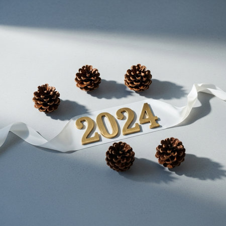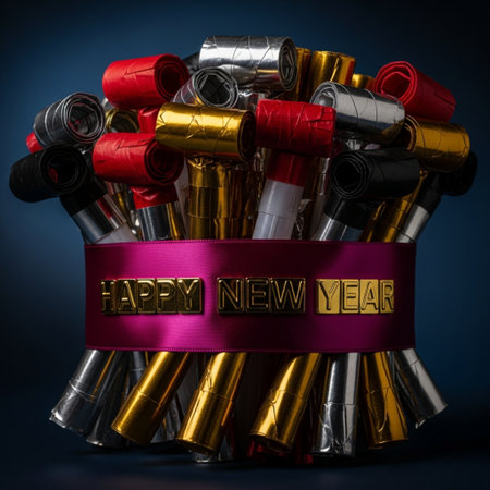 New Year's Eve fireworks on a dark blue background with a red ribbon