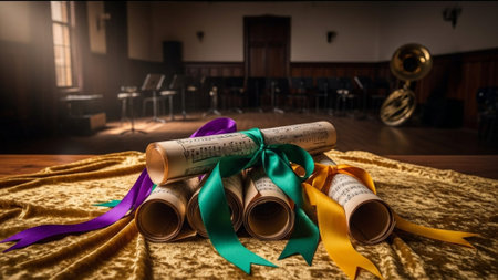 Cinematic wide shot (16:9) featuring rolled musical scores tied with purple, green, and gold Carniva