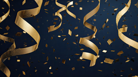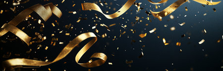 A captivating display of shimmering gold confetti and elegant ribbons falling gracefully, creating a festive atmosphere perfect for celebrations and events.