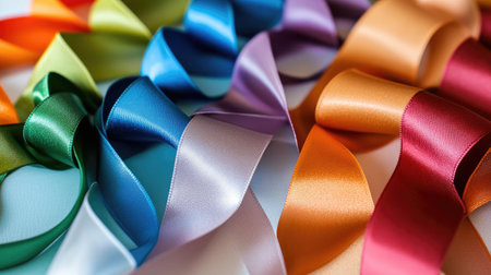 Satin ribbon in various colors arranged in a spiral pattern, ideal for festive decoration concepts -