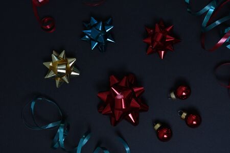 Multi-colored ornaments and red balls lie on a black