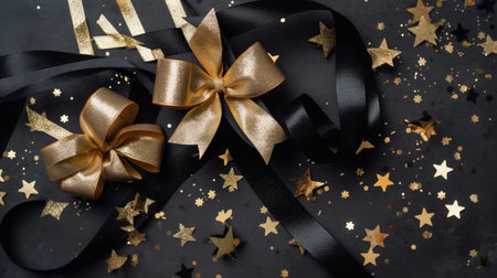 Black ribbon with gold bow and confetti on black background. vector illustration