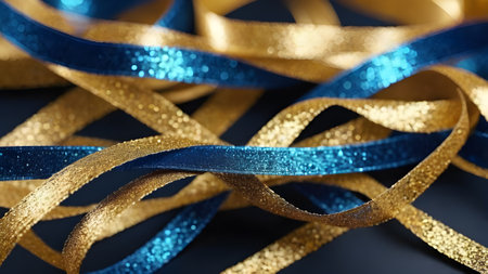 Blue and gold ribbons and confetti on a blue background.