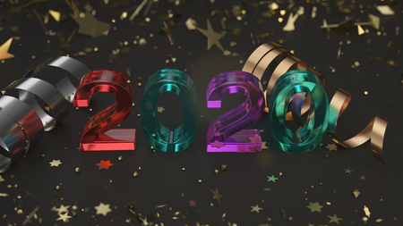 Glass 2020 number with golden confetti and serpentine on black background. 2020 new year sign. 3D rendering illustration