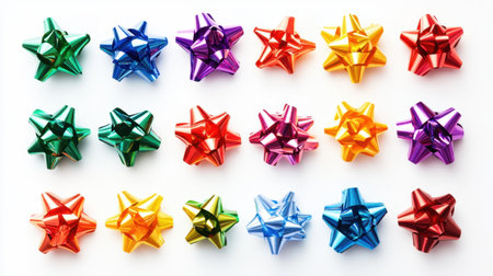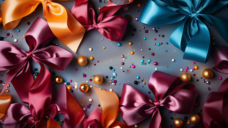 Festive Elegance A Flat Lay of Colorful Satin Ribbons with Gold Confetti on White Background
