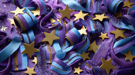 This image features a vibrant mix of colorful confetti, golden stars, and shimmering ribbons, perfect for festive decorations and celebrations.