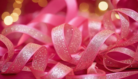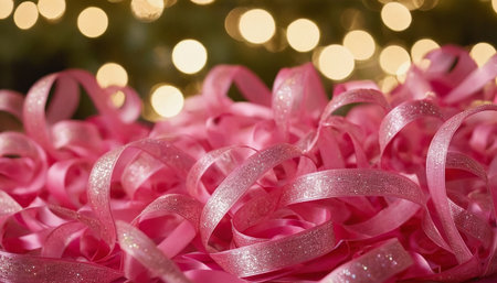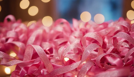 Decorative pink ribbon with bokeh lights as background, closeup