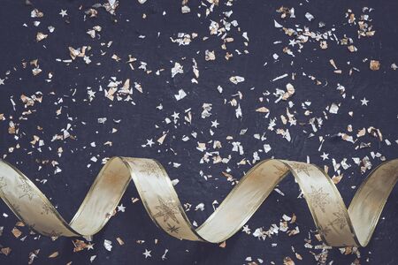 Golden ribbon with bow and confetti on dark background, closeup