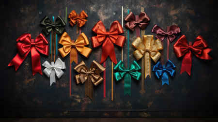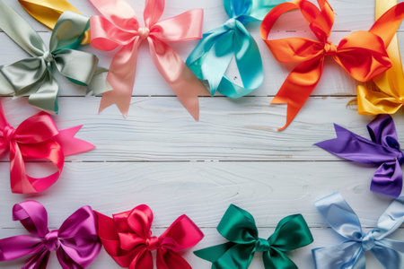 An array of beautifully crafted bows in various colors showcases creativity and craftsmanship. The ribbons, perfectly tied and arranged, transform the simple wooden background into a cheerful sight.