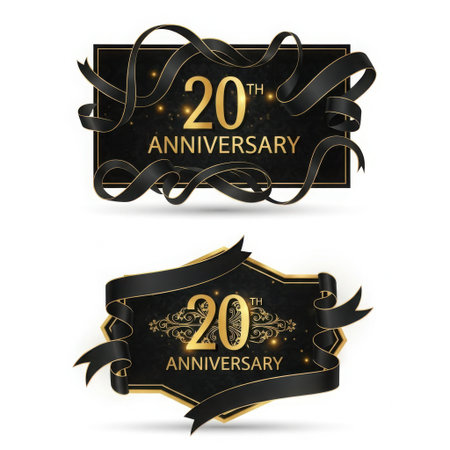 Two ornate black banners featuring golden '20th Anniversary' text and decorative black ribbons, perfect for special occasions.