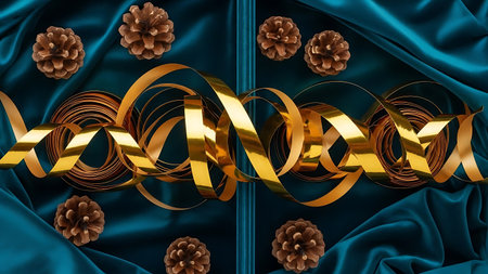 Golden ribbon and pinecones on luxurious teal fabric
