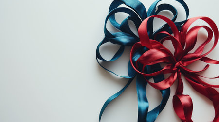 Red and blue gift ribbons entwined on a white background