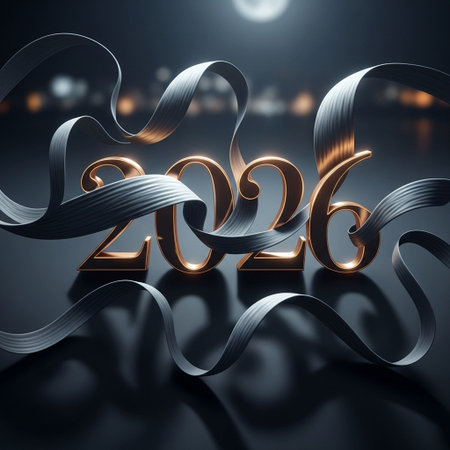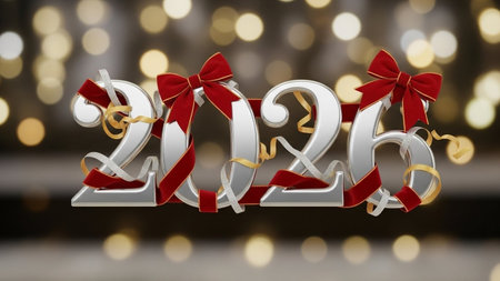 New Year 2026 with ribbons on bokeh background, 3d render