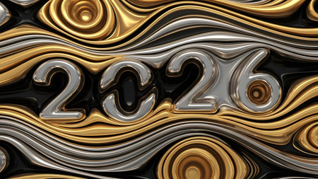 The year 2026 is prominently displayed in metallic silver numbers, set against a dynamic background of swirling gold, silver, and black waves, creating a luxurious and celebratory feel.