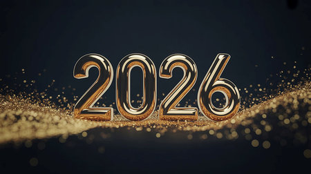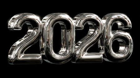 The year 2026 is depicted as 3D numbers made of many small, shiny metallic balls. Clear details a...