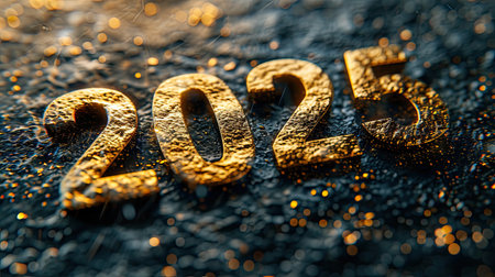 Golden 2025 numbers sparkling on a dark blue textured surface represent the upcoming new year and future possibilities