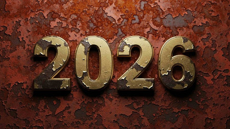 Bold metallic numbers 2026 displayed in a worn and weathered style against a neutral background