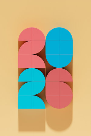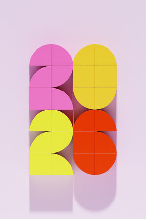 Geometric numbers 2026 formed by overlapping shapes in red blue and yellow with transparency.