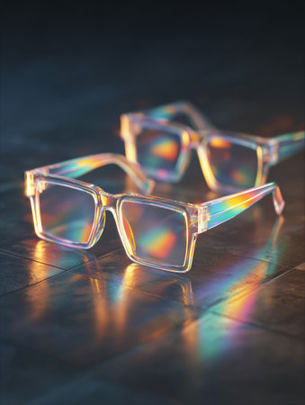 Spectacular transparent glasses with holographic edges create a striking visual effect on a reflective surface, enhancing the futuristic aesthetic.
