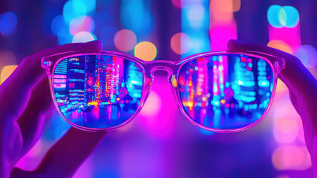 A captivating image showcasing the reflection of a citys lights in sunglasses, creating a mesmerizing visual experience.