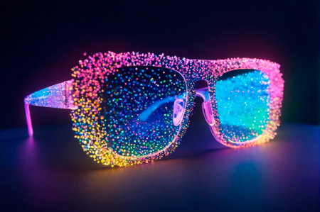 A captivating image of stylish futuristic glasses with vibrant lenses, showcasing a blend of color plays and modern design elements in a creative setting.