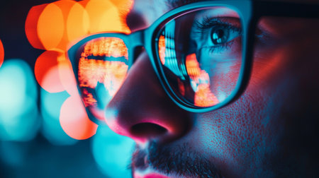 Close-up portrait of a man wearing glasses, with reflections of city lights on the lenses, symbolizing focus, urban lifestyle, and night ambiance.