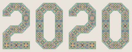 Colorful Vector 2020 year sign in Palace of Alhambra Style. Moorish geometric ornate.