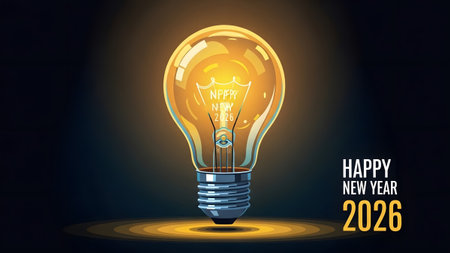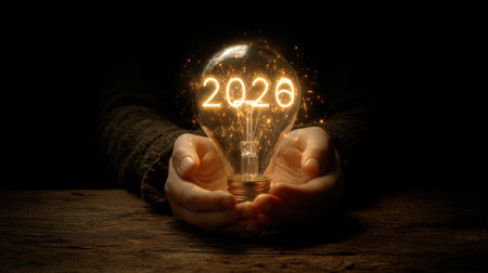 A lit lightbulb displays HAPPY NEW YEAR 2026 text, radiating warmth and light. Clear details an...