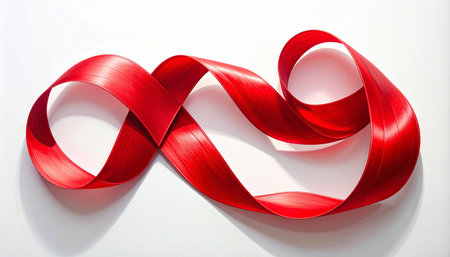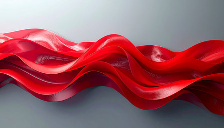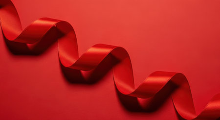 A close-up shot of a glossy red ribbon elegantly curling and twisting across a rich red backdrop, creating a sense of luxury and celebration.