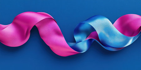 A 3D digital art of two intertwined ribbons, one in vibrant pink and the other in electric blue, against an indigo background. The colorful ribbons form waves that move gently, creating dynamic movement on a flat surface. --ar 2:1 --v 6.1 Job ID: 9b7993f9-02bb-4b30-b229-7060231faea1