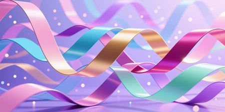 Vibrant, pastel-colored ribbons swirl and twist, forming a dynamic, whimsical scene with soft purple hues and glittering white dots in the background.