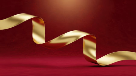 An elegant golden ribbon gracefully curves and flows across a rich red background. The ribbon's smooth texture and the play of light create a sense of movement and sophistication.