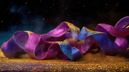 A striking image of colorful ribbons sparkling with glitter against a dark backdrop. The vibrant hues and flowing shapes create a sense of elegance and festivity.