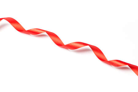 Elegant red ribbon captured mid-air, set against a white backdrop, perfect for highlighting its graceful movement