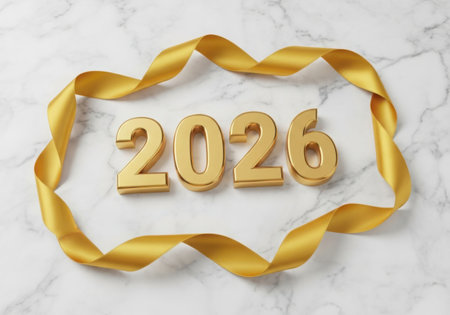 Golden ribbon forms a decorative frame around wooden numbers spelling out 2026, set against a textured marble background.