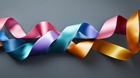A colorful, abstract, and creative background for product photography with flowing ribbons of fabric in the shape of an S-curve. The ribbon is made from thick, vibrant colors such as blue, pink, orange, yellow, green, purple, and teal. It is placed against a plain gray backdrop to highlight its color and texture. There should be no shadows or reflections on the surface. This composition creates a sense of movement and energy that makes it perfect for showcasing products. --chaos 30 --ar 16:9 --v 6.1 Job ID: cd7fb17b-b1ff-4851-8488-725a3329c2d7