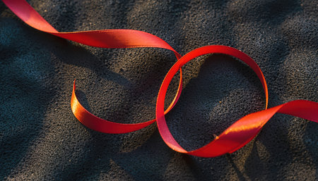 A vibrant red ribbon, with a smooth and reflective surface, gracefully winds across a dark, granular background. The rich color of the ribbon stands in striking contrast to the muted tones of the textured surface, which appears to be fine sand or gravel. Dramatic lighting highlights the curves and folds of the ribbon, creating an elegant visual effect with subtle shadows. This composition evokes feelings of celebration, luxury, and special occasions, making it suitable for designs related to gifts, romance, or festive themes.