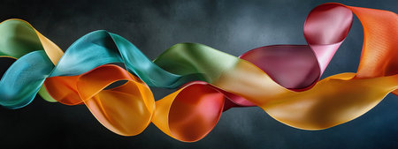 A close-up view of several flowing ribbons in vibrant shades of teal orange magenta and yellow creating a dynamic...