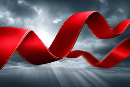 Red ribbon with golden stitching floating in dramatic cloudy sky with light rays, ideal for luxury, celebration, and success concepts