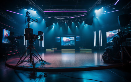 Electricity illuminates modern stage for rock music performance photography shoot generated by artificial intelligence