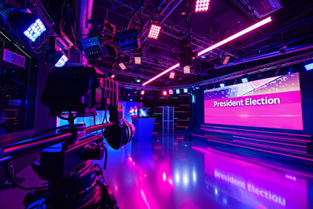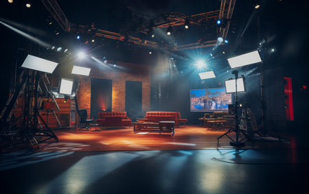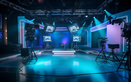 Wide shot of an empty TV set pre-production with lighting and cameras.