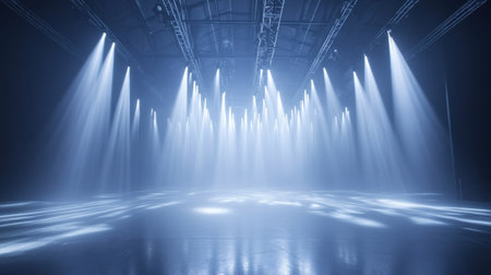 A spacious empty studio featuring dramatic lighting and fog effects, ideal for artistic photography sessions, creative projects, and dynamic visual productions.