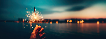 Hand Holding a Lit Sparkler Against a Bokeh Background. Concept of Celebration, Festivity, New Year's, Party Fun. Festive backdrop.