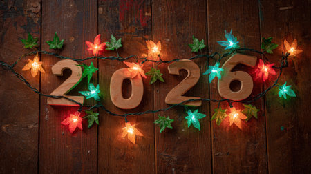 The year 2026 is represented by wooden numbers adorned with vibrant autumn leaves and festive string lights, set against a textured, rustic wooden surface.